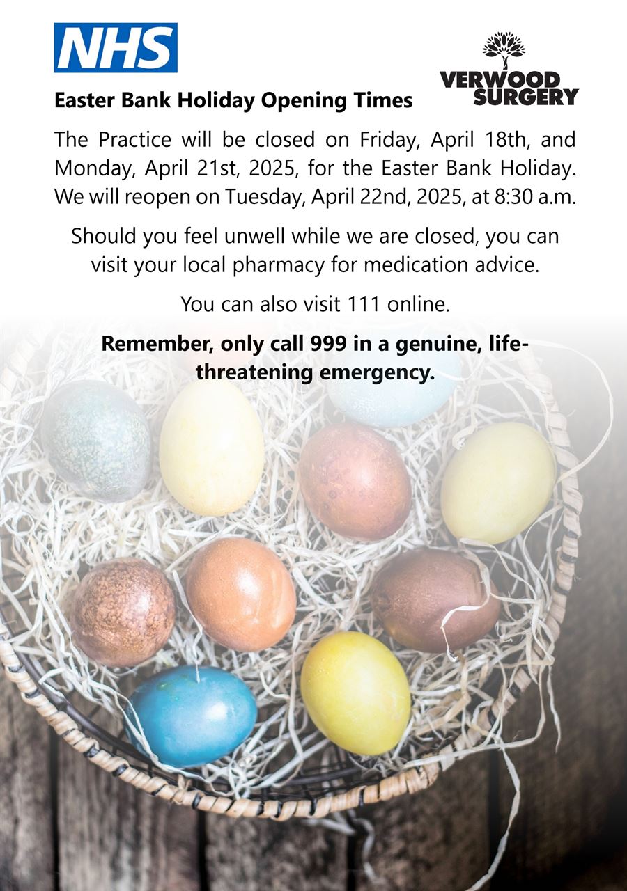 Please note that Verwood Surgery will be closed from 6:30 pm Wednesday the 24th of December until 8.30 am Monday the 29th of December.
